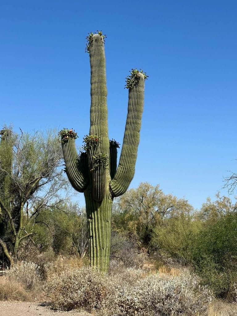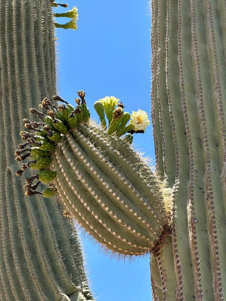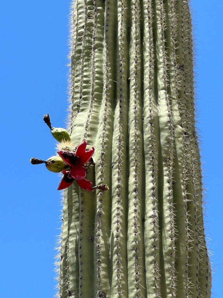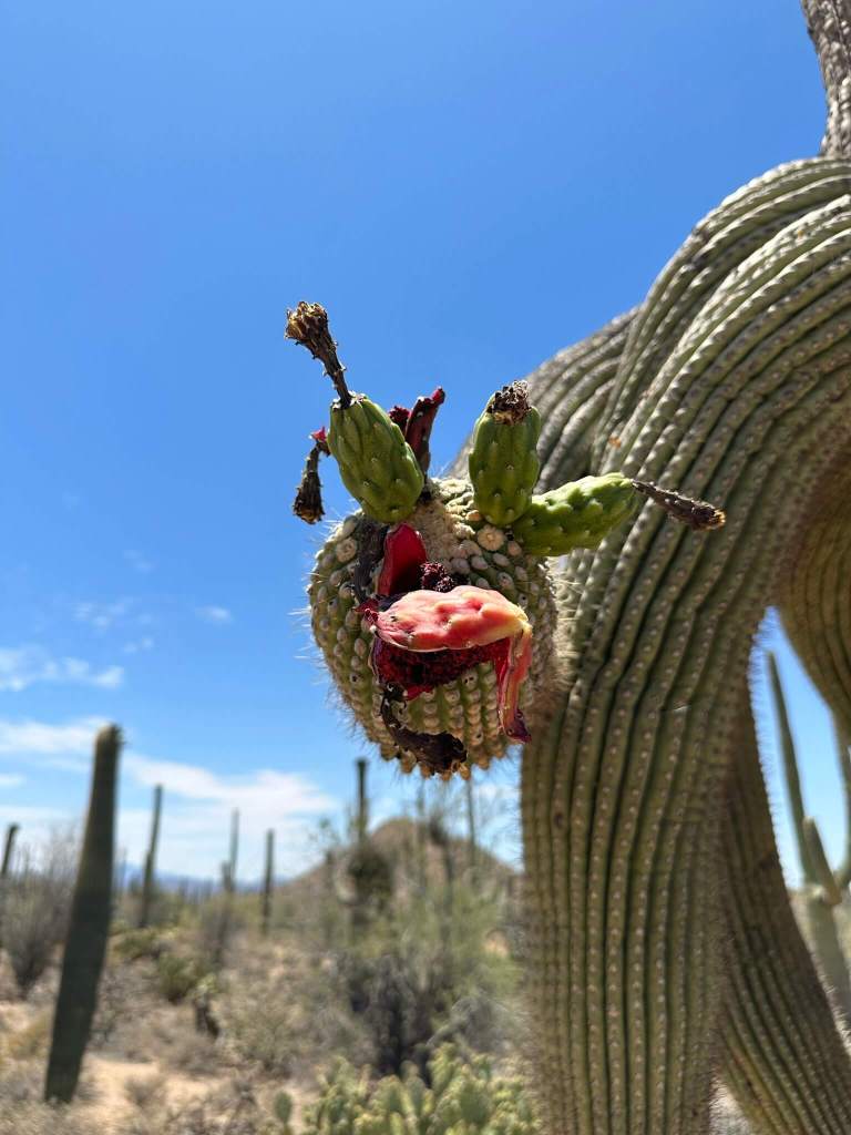 - There is so much information I don’t have time to type it all in here. I’d encourage you to look it up online. A few of the highlights though are: Saguaros begin flowering when they grow about eight feet tall or between 35-65 years old. When they reach between 50-100 years old they may begin sprouting branches or “arms”. At 100-150 years they are between 15-30 plus feet tall. Some exceptional individuals may live over 200 years and reach 50 feet in height. Also, there is a difference in growth rate between the east and west side of the park. The east grows faster than the west due to the increased amount of rain it gets. The root structure is only a few inches below the surface and goes out as far as the saguaro is tall. Lastly, make sure to look up Saguaro boot. It’s the nest cavity formed by a Gila Woodpecker or Gilded Flicker. Seriously lastly, the saguaro fruit is highly important to the ecosystem here. Coyotes, birds, people, and just about everything else here either eats the fruit or the seeds. There is approximately 1000 seeds per fruit difference between the west park (2500) and the east park (3500). Speaking of the fruits, the flowers that bloom above the ovary (the fruit portion) open at night and remain open for pollination for only one day before wilting away thus laying open the fruit portion. So, if you see white it’s the flowers and if you see red, it’s the fruit . The doves (and many other birds) migrate up from Mexico just in time to pollinate the flowers when they open. As I said, the fruit is highly desired by just about everything. The ranger says it tastes similar to kiwi.
