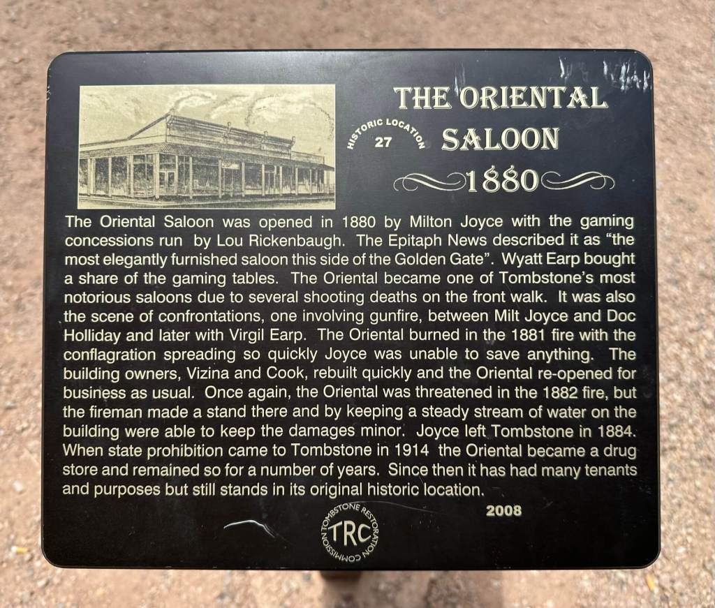- Leaving Boothill we headed on into town and basically just walked around a lot. We did stop in at The Oriental Saloon to drink a beer and diet coke just to say that we did while we were there. The bartender was dressed up like a dance hall girl and it was funny to see her on her cell phone leaned up against the back counter when she wasn’t busy. You had to pay money to see any of the gunfights so we didn’t go to them. Same for the O.K. Corral. You had to pay to see it. I’m all for making money but that seemed a little cheesy to charge just to see it.